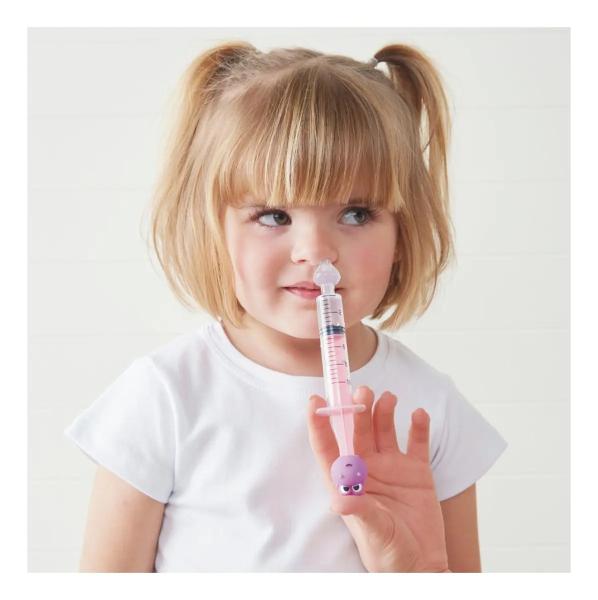 Adicione de 5 a 10 ml de soro fisiológico em temperatura ambiente na seringa. Com o bebê sentado e tronco ligeiramente inclinado para a frente, introduza suavemente a ponteira de silicone na narina e aplique o líquido, que entra por um lado e é drenado pelo outro.