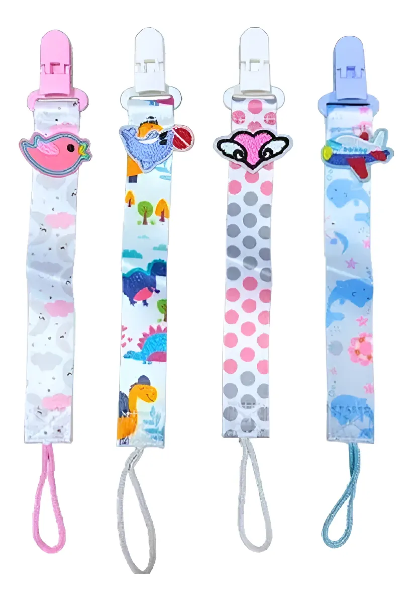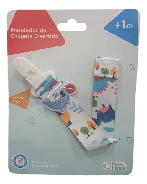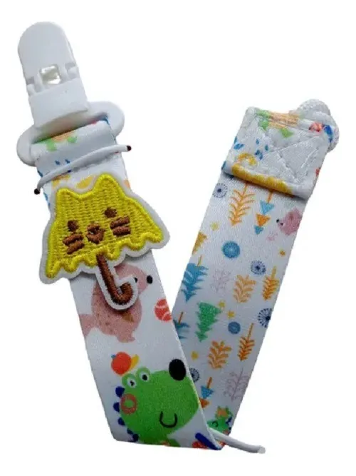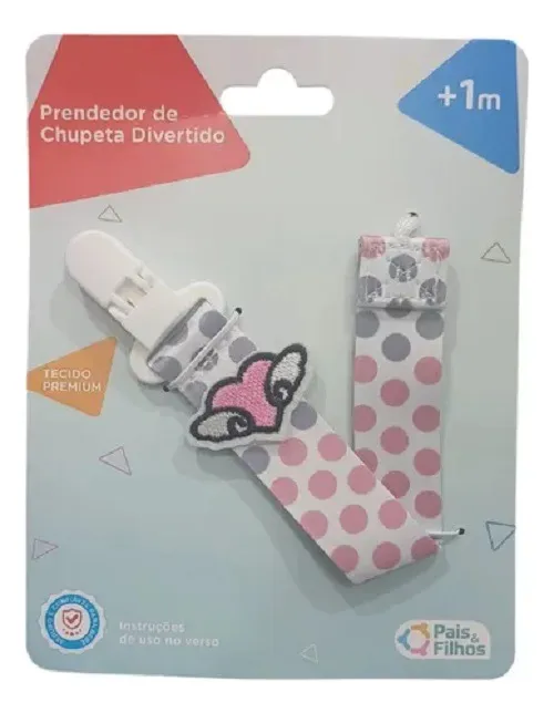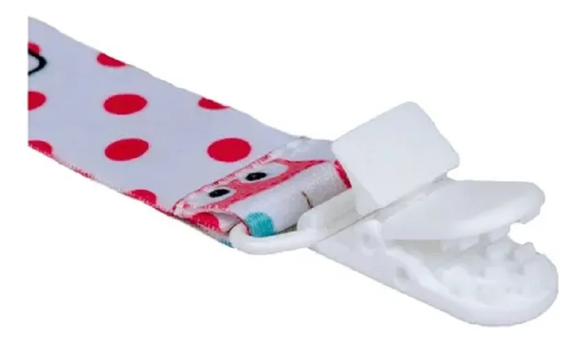 Prendedor com clip para prender na roupa e cordão para segurar a chupeta, serve em chupetas com botão e em chupetas com argola, leve, seguro e firme.